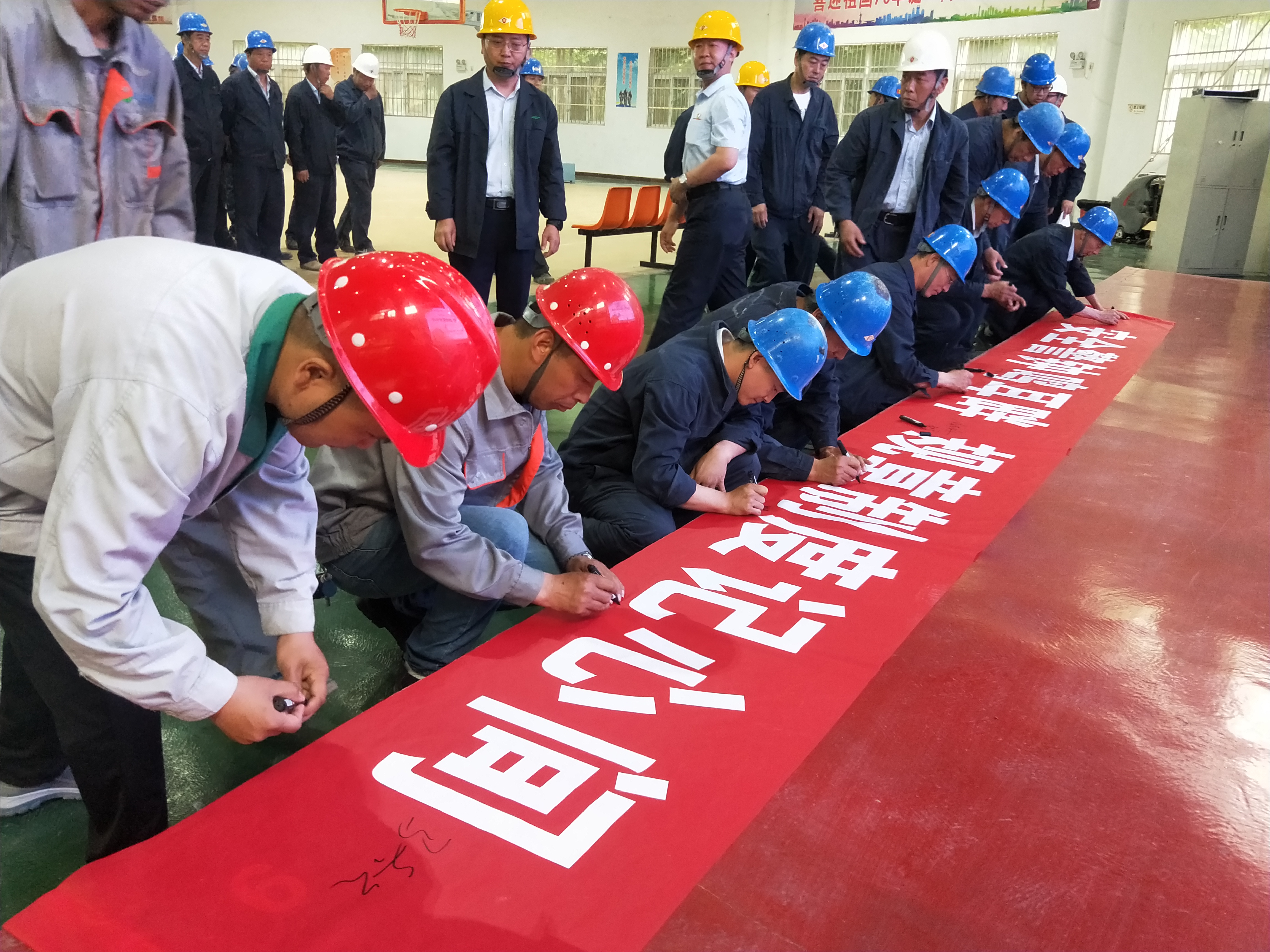 黃河同力副總經(jīng)理陳克政宣布黃河同力“安全生產(chǎn)月”啟動儀式正式開始。全體人員在安全標(biāo)語紅幅上簽名。
